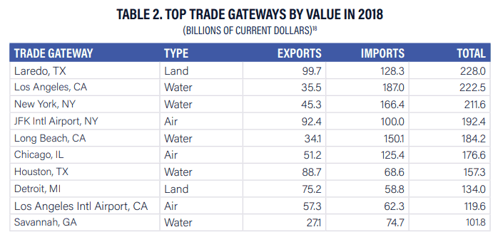 Here is an interesting question: what are the top US "gateways" for global trade (imports and exports)?